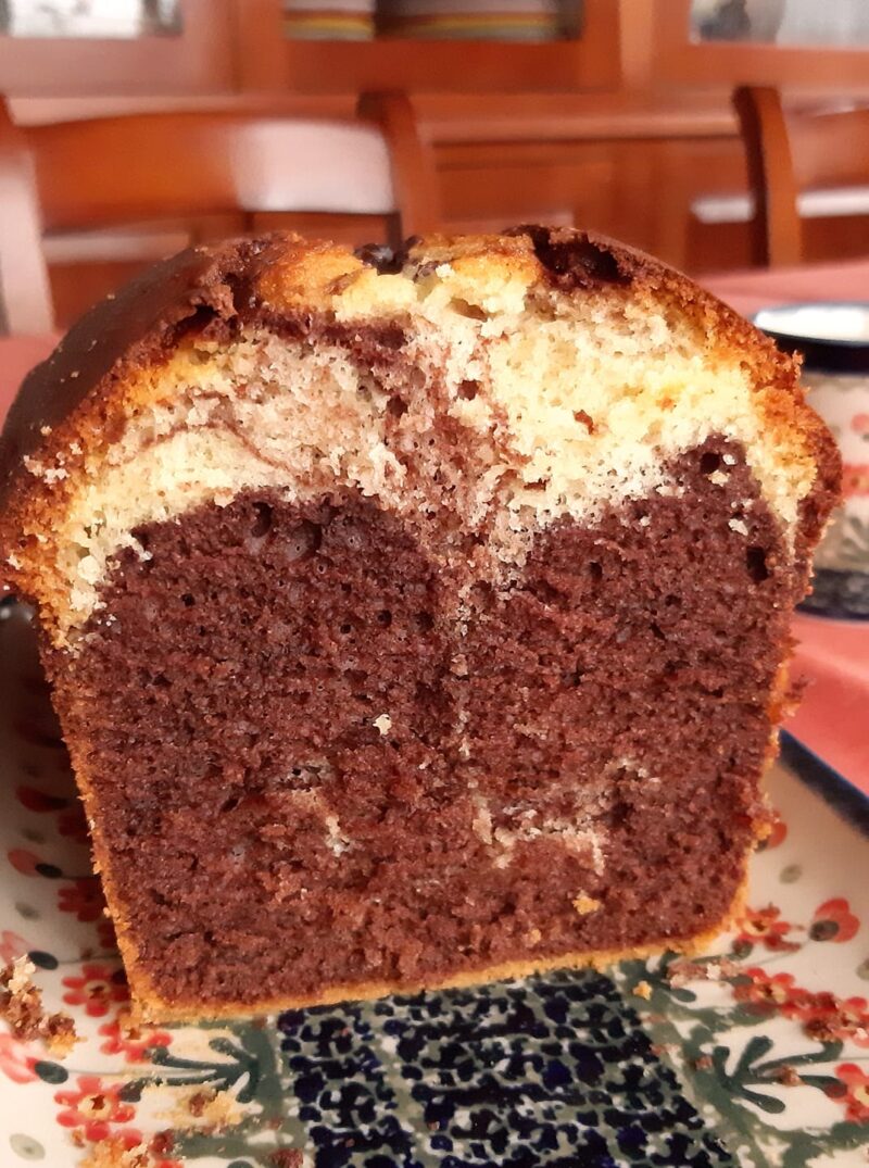 Przełóż połowę ciasta do keksówki lub formy na babkę. Do drugiej połowy dodaj kakao i dobrze wymieszaj. Wlej kakaowe ciasto na wierzch. Przemieszaj patyczkiem, żeby ciasta się nieco przemieszały.
