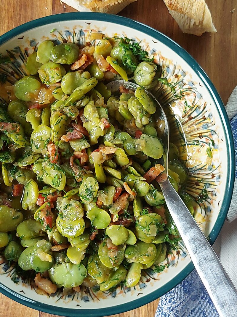 Bób z boczkiem i koperkiem w sosie z białego wina