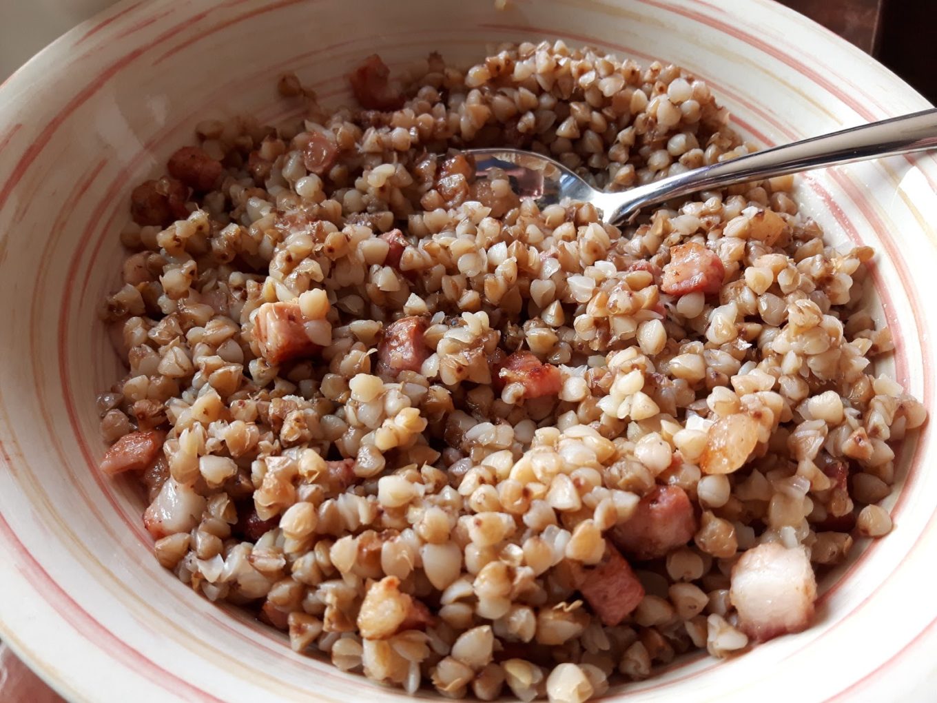 W ten sam sposób (tylko bez boczku) przygotowuję kaszę podawaną jako dodatek do mięsa.