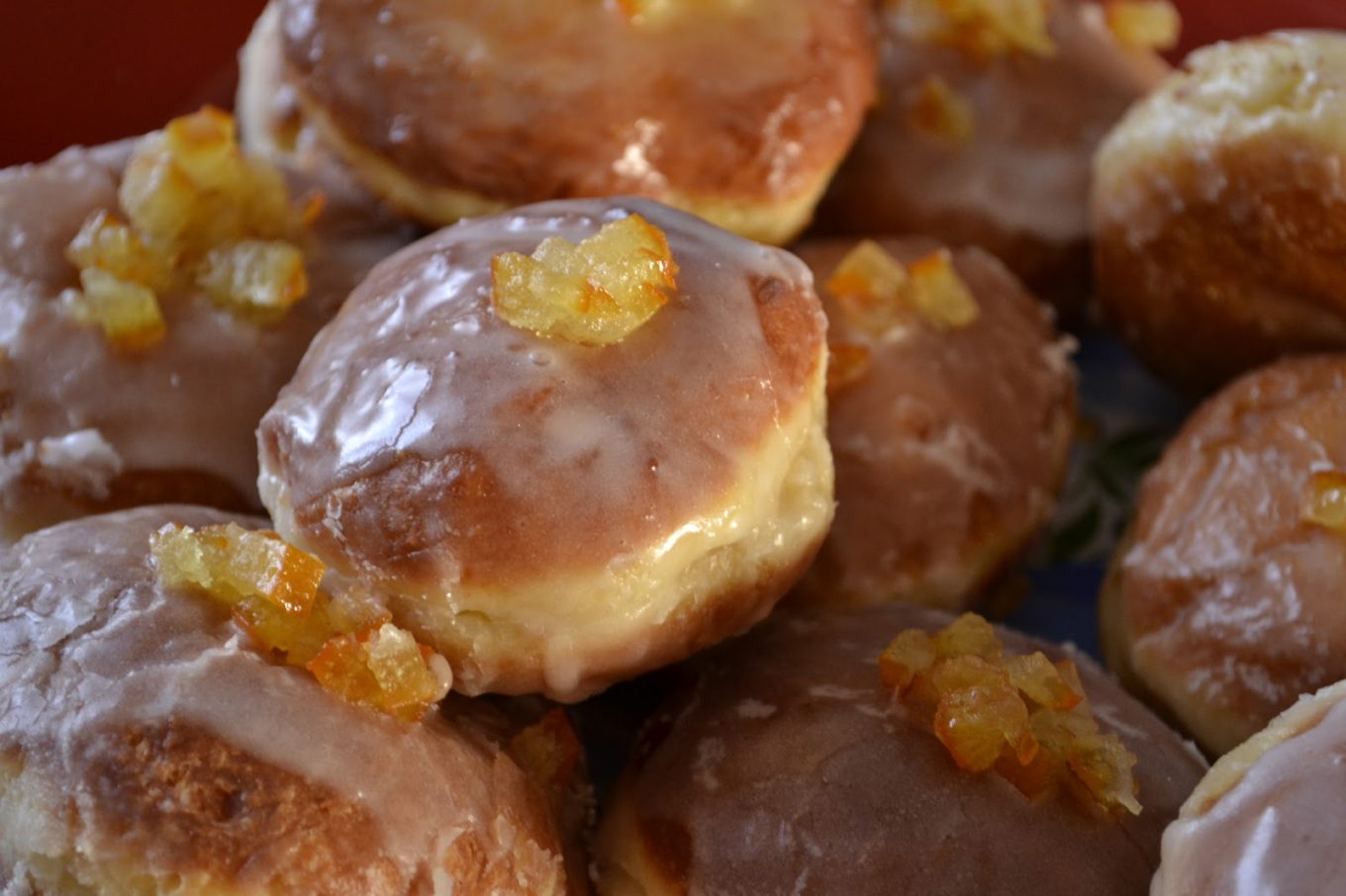 Upieczone i osączone pączki polukruj, posyp skórką pomarańczową i odłóż na półmisek.