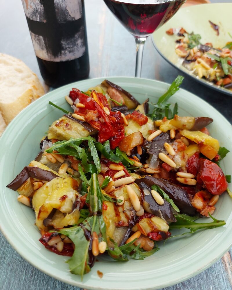 SAŁATKA Z PIECZONEGO BAKŁAŻANA i SUSZONYCH POMIDORÓW Z BOCZKIEM