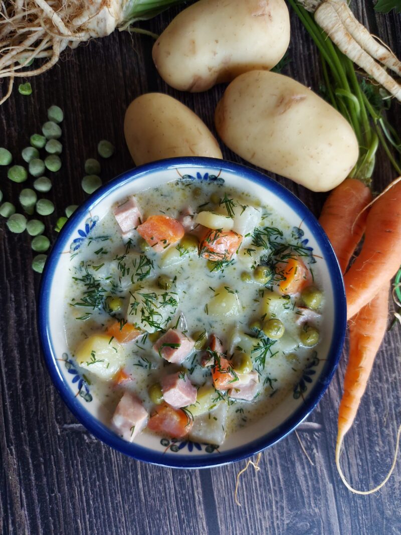 ZUPA JARZYNOWA Z SZYNKĄ I ZIELONYM GROSZKIEM