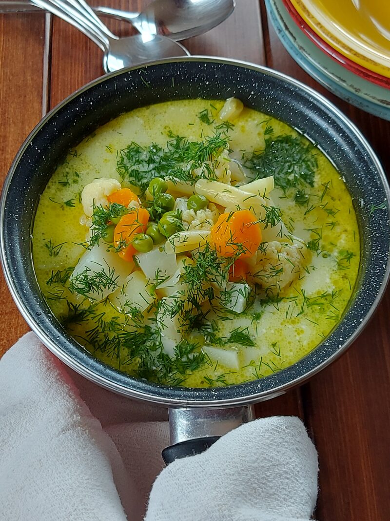 Jeśli bardzo chcesz – możesz podduszone warzywa zasypać łyżką mąki (jak w zupie jarzynowej z groszkiem), ale moim zdaniem to nie jest potrzebne. Zamiast wody można użyć dowolnego bulionu.